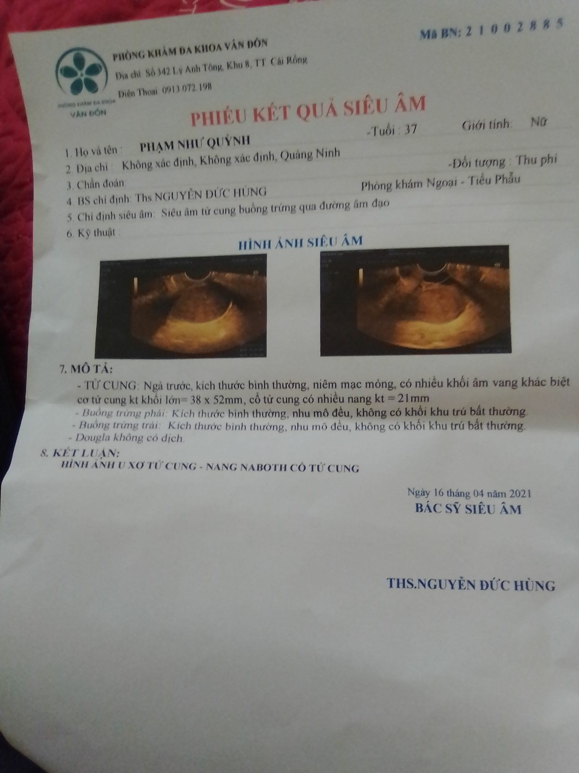 2. Chia sẻ của  Anh Cường, chị Ngân (Thôn 4 – xã Hoằng Ngọc – huyện Hoằng Hóa – tỉnh Thanh Hóa) : khối u xơ kích thước 21 x 14 mm giảm sau khi sử dụng.